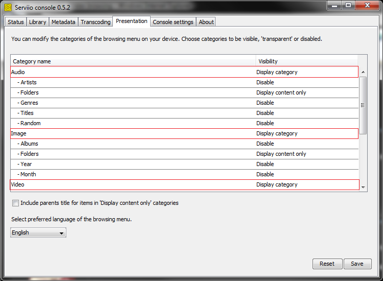 2. In Serviio console, make sure you have the MAIN folders set to display in the presentation menu. (Ones in RED are the important ones; the rest can be anything you like.)